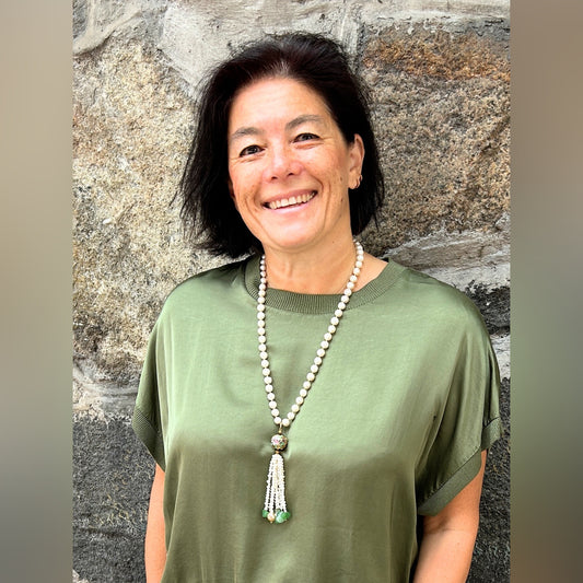I started creating jewellery 20 years ago in Hong Kong. I was born in Milan, raised in Italy, Canada and Monaco and spent my childhood surrounded by the most glamorous, noisy, vibrant women. I am a mix of Italian and Chinese heritage. A heady combination of passion and a head strong belief that I wanted to make jewellery and accessories inspired by the women I was surrounded by in my childhood set me on this path to found my company. I source jewellery from around the world but also create my own line which celebrates my maximalist approach to living my life. Vibrant and colourful combinations of beads made from pearls, precious stones, ceramic and horn are all hand made by me. I want to create jewellery that makes people smile. Bracelets that can be worn stacked on a wrist at the beach paired with my beautiful kaftans, a pendant necklace of horn worn with a white shirt and tailored trousers for a meeting or a pearl choker layered with one of my silk scarves. My jewellery is ethically sourced from female owned makers (as much as possible) and the beads I use are all hand picked and designed by me. Welcome to the world of Jen Monili!