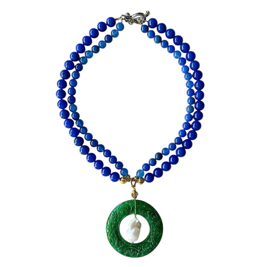 Blue agate 2 strand choker with jade carved donut and baroque freshwater pearl