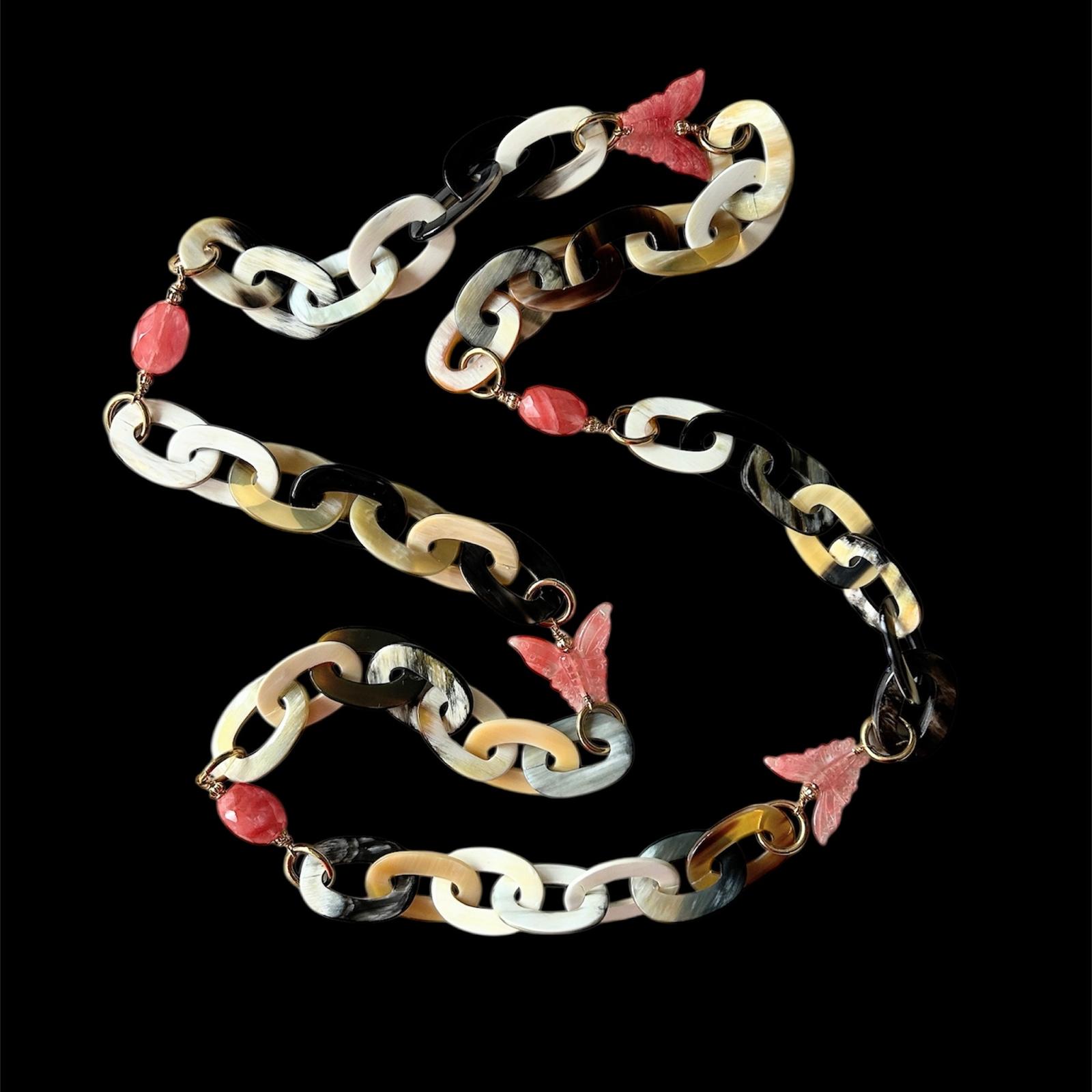 Buffalo horn necklace with strawberry quartz butterflies and beads