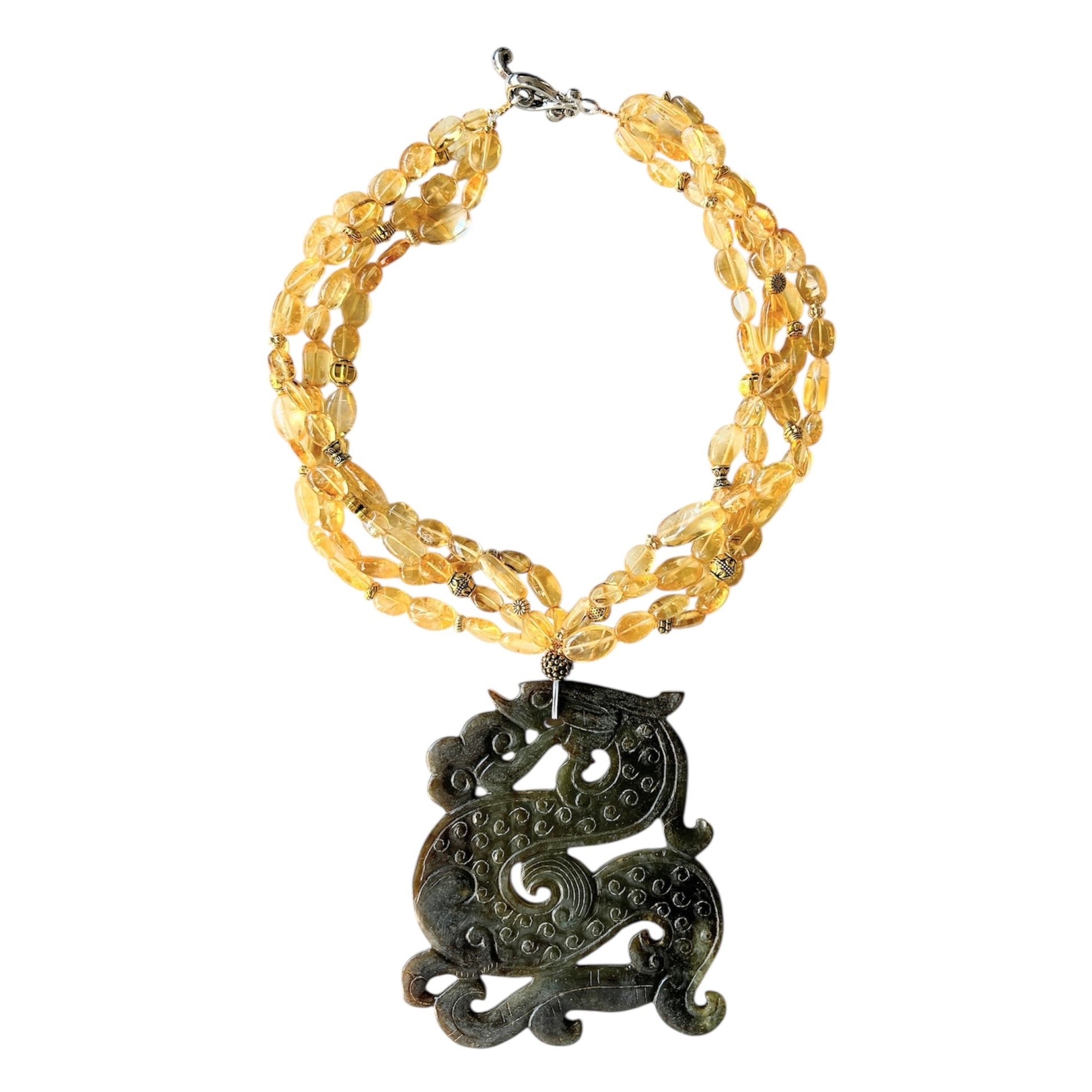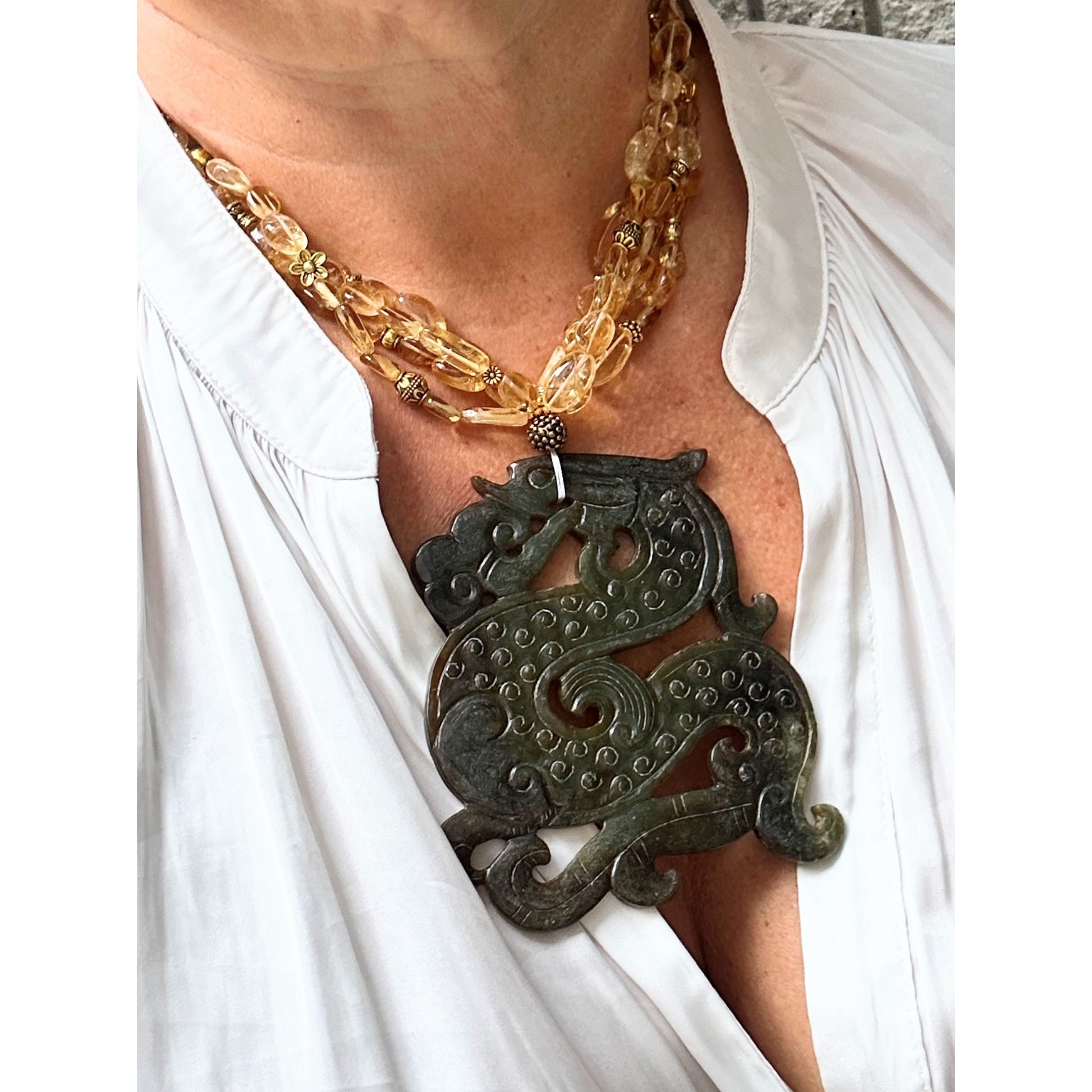 Unique statement piece! A very large carved jade fire spitting dragon hangs on a four strand citrine choker