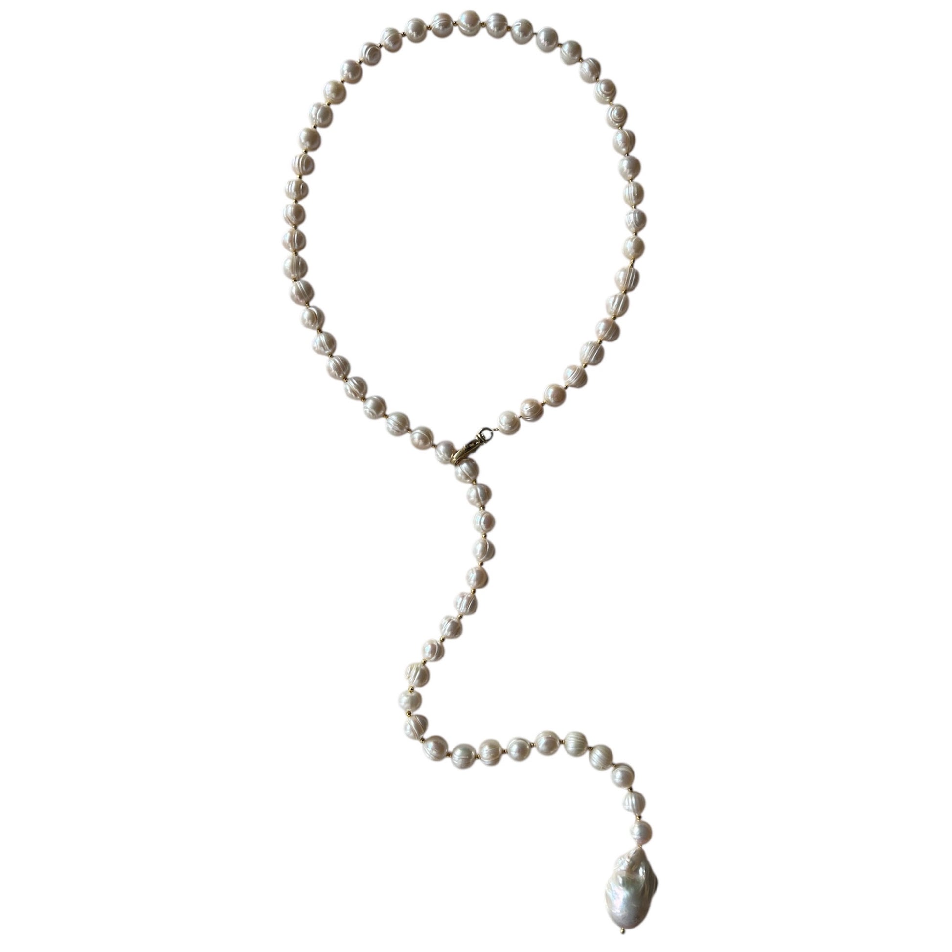 Striped freshwater pearls, finished with a very large baroque freshwater pearl. The lobster clasp is made of brass